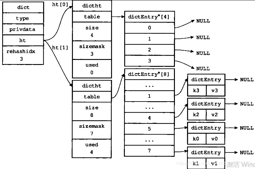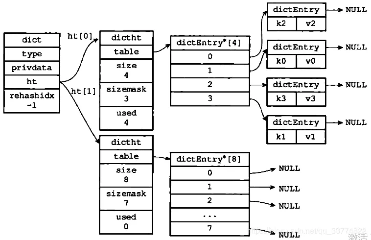 redis的哈希表采用链地址法来解决键冲突,上面的整个结构图中的哈希节点dictEntry有一个next指针,他是指向下一个节点的。