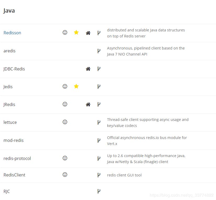 首先先去官网看一下,如下图,官网推荐的笑脸和爱心表示“使用我把,我稳定啊,社区活跃啊”,so,我们选了Jedis,emmm,就是这么简单和直接。