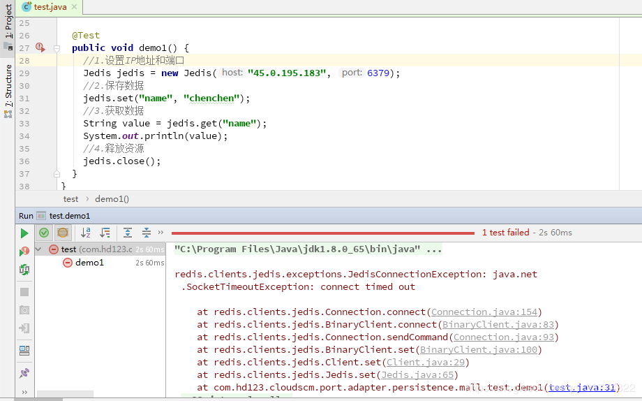 我们用jedis连接上远端的redis,可是发现根据连不上,具体报错如下图。