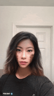 我用黑色的活性炭面膜遮住了一部分脸,得出的渲染效果似乎很稳定。女性的滤镜确实将面膜稍微消除了。从下面的GIF可以很明显地看出,“面部交换”功能仅限于追踪头部的矩形区域(注意头发到达我肩膀时的尖锐截止)。