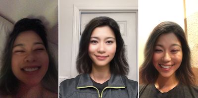 中间的照片是一张浴室自拍的原始照片。左边是“男性”滤镜的效果,右边是“女性”滤镜的效果。