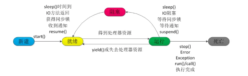 线程是依附于进程的, 进程是分配资源的最小单位,一个进程可以生成多个线程,这些线程拥有共享的进程资源。 就每个线程而言,只有很少的独有资源, 如:控制线程运行的线程控制块,保留局部变量和少数参数的栈空间等。 在线程的生命周期中,它要经过新建(New)、就绪(Runnable)、运行(Running)、阻塞(Blocked)和死亡(Dead)5种状态。