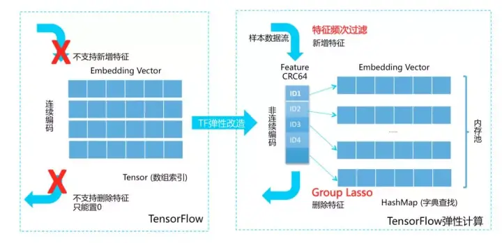 每个特征都通过hash函数映射到一个2的64次方大小的空间内。当需要计算该特征时,PS会按需惰性创建并返回之。但其上层行为与原生TF一致。由于去掉了featuremap转ID的过程,我们内部形象地将其称为“去ID化”。在此之上我们实现了Group Lasso FTRL,频次过滤和模型压缩等一系列算法。