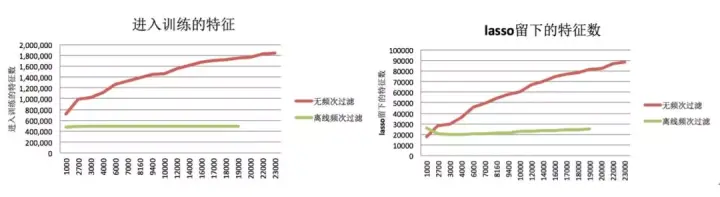 由于FTRL在设计和推导时并未明确考虑极低频特征,虽然通过增大λ,确实能去除大量极低频特征,但由于约束太强,导致部分有效特征也被lasso,在离线实验中被证明严重影响性能。其次,对这些巨量极低频特征,保存历史信息的工程代价是很高昂的(增加几倍的参数空间和存储需求),如下图: