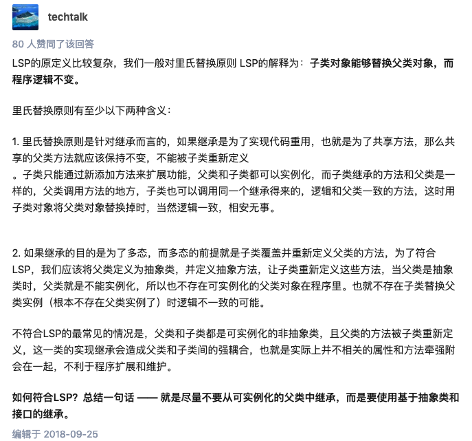 子类的方法实现父类方法时(重写,实现抽象方法) 方法的后置条件(方法的输出、返回值)要比父类更严格或者相同。