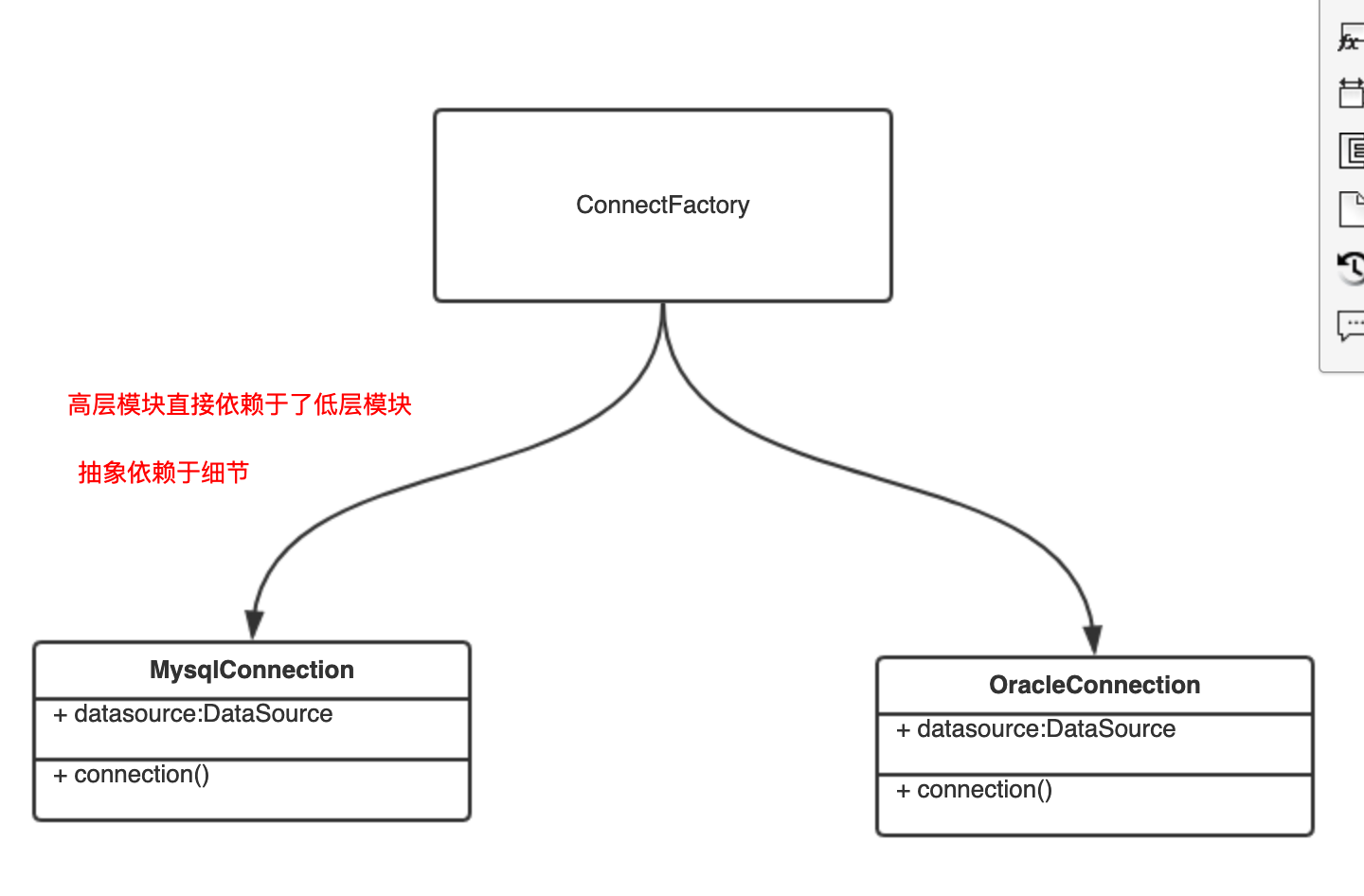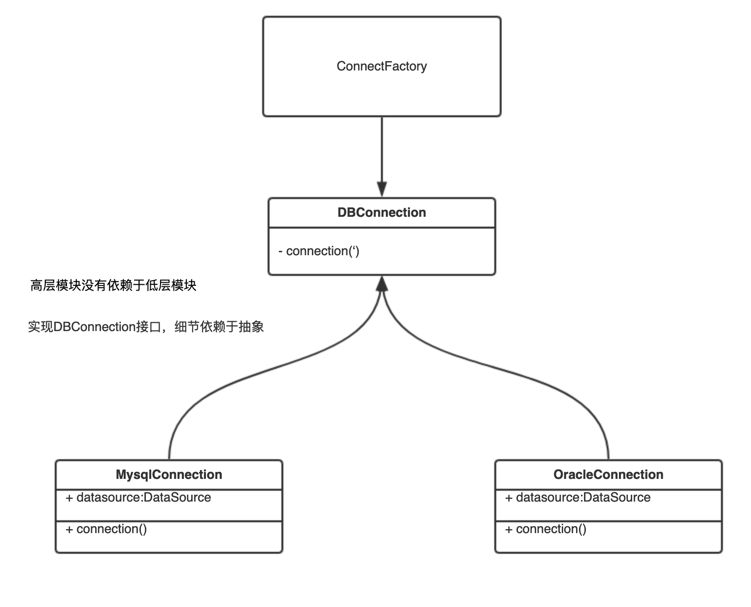 表面看起来说是要抽象以及针对接口编程。那么为什么叫依赖倒置原则呢?我们还是用职责单一原则中数据库连接的类来举例。