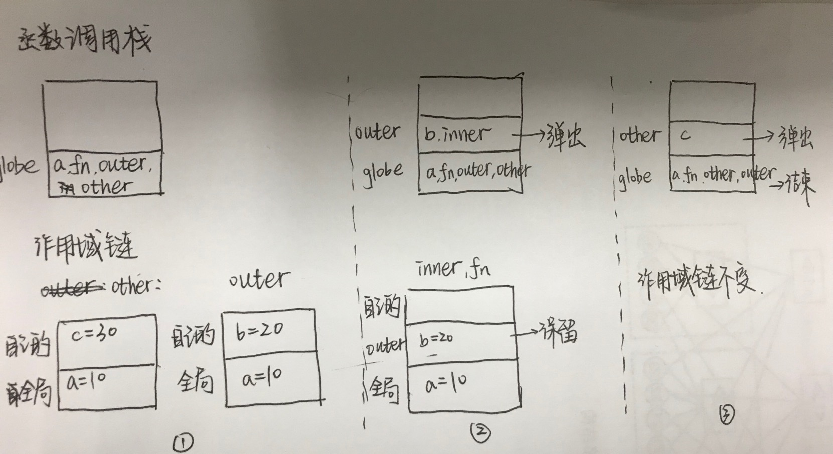 接着调用other,也是同样的步骤,注意执行到fn时,因为fn被赋值inner,作用域跟inner一样,而inner的作用域链在定义的时候就确定了,无论在哪里执行都不会改变,所以此时inner的作用域链也只有自己、outer和全局的,并不能访问到other中的变量,所以找不到c。