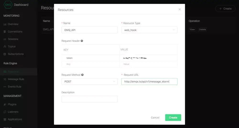 与EMQ X的其他功能一样,规则引擎也提供类似的HTTP REST API,以便于用户集成应用程序开发。规则引擎的可视化创建,编辑和管理功能也在EMQ X仪表板中实现