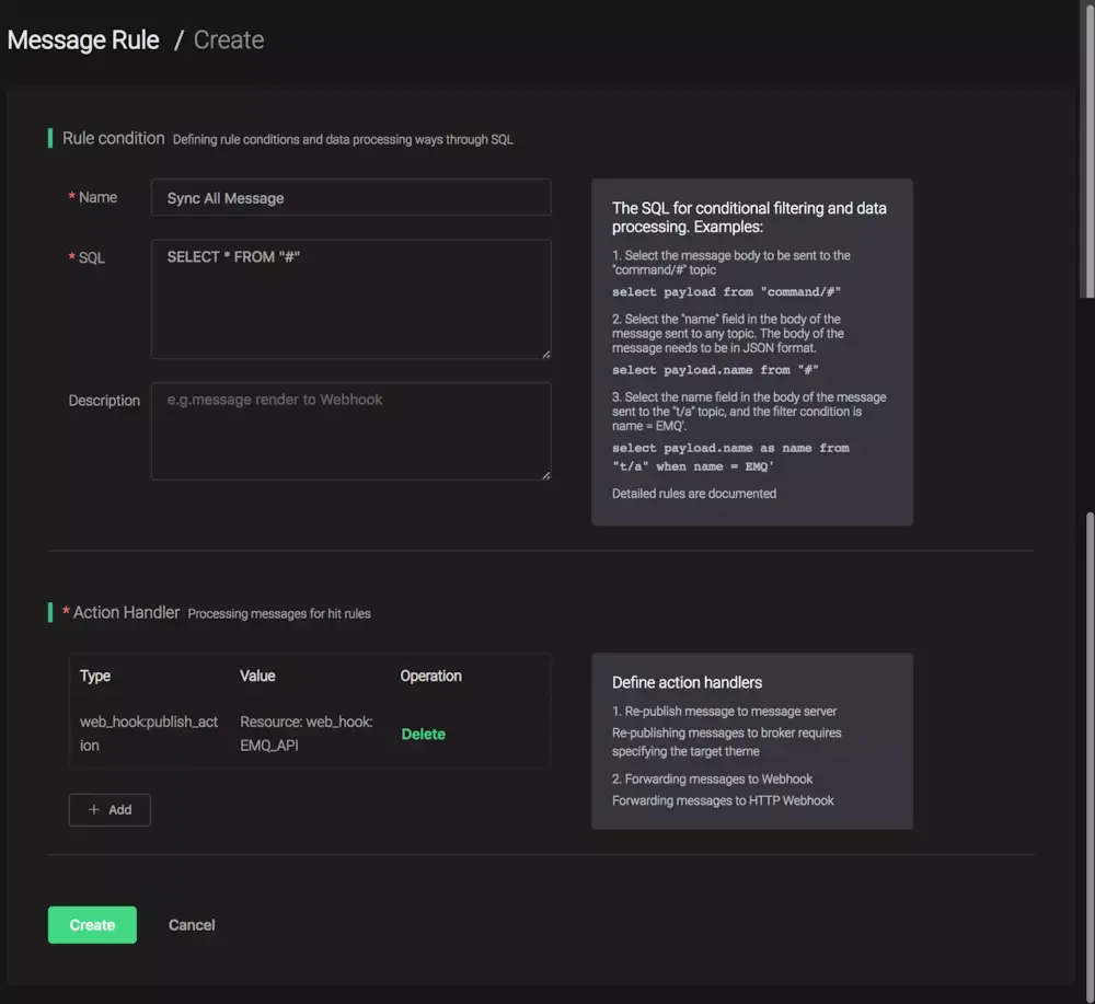 规则引擎提供基于SQL表达式的数据查询和处理功能,允许用户在配置后续处理操作之前过滤数据并将消息转换为预设格式。