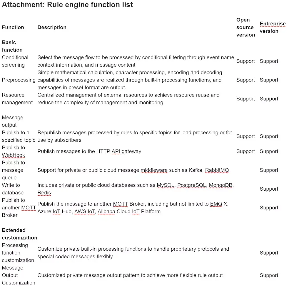 规则引擎的开源版本提供了基本的处理功能,并已集成到EMQ X v3.1.0中。正在开发一种更灵活,更实用和可定制的规则引擎用于测试,计划在下一个EMQ X企业版中发布。