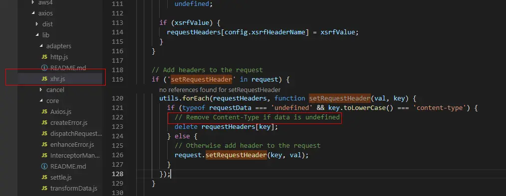 再次请求会发现后端报错415 UnSupported Media Type,因为当以params方式提交post参数时,请求头中无Content-Type字段,Axios源码中对请求做了处理,如下图: