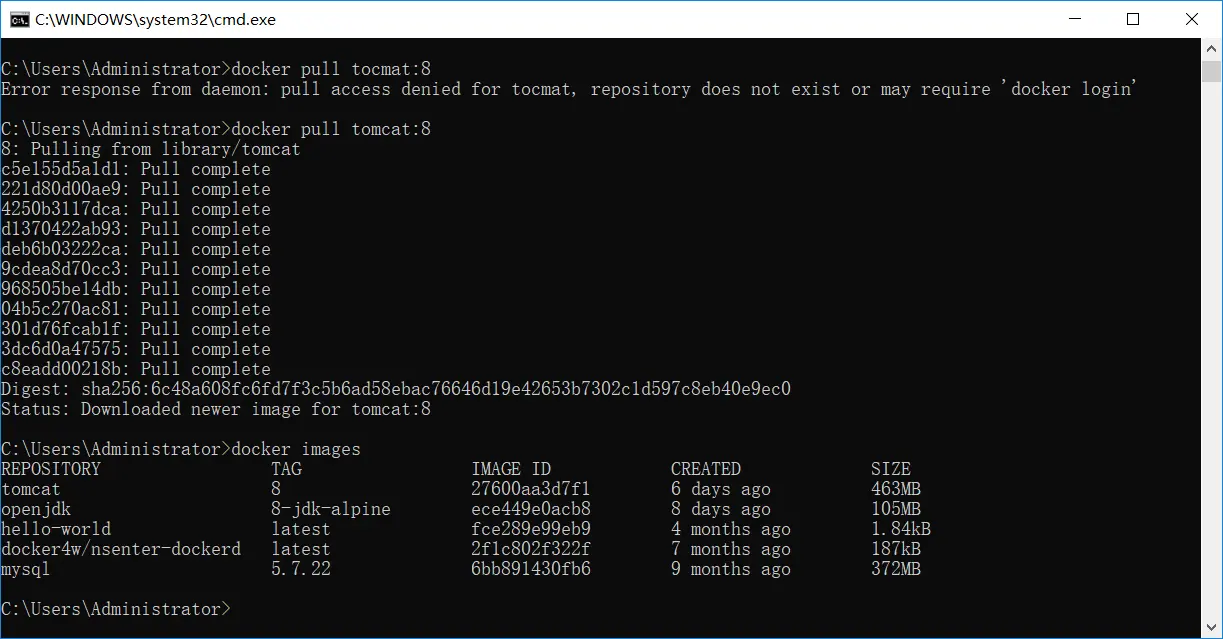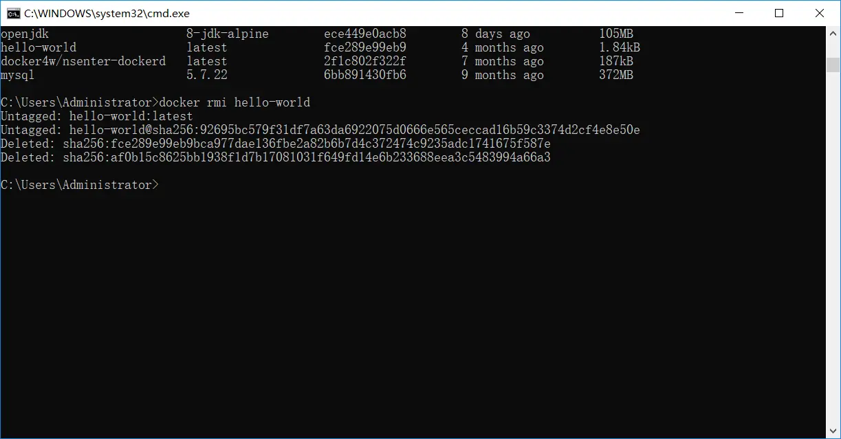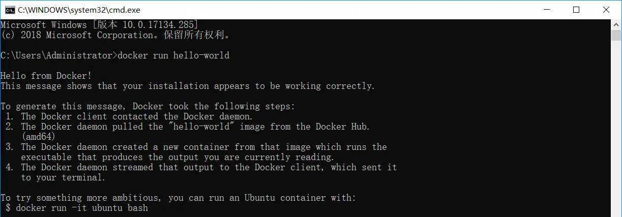 运行cmd > docker run hello-world; 出现如下界面表明可正常使用