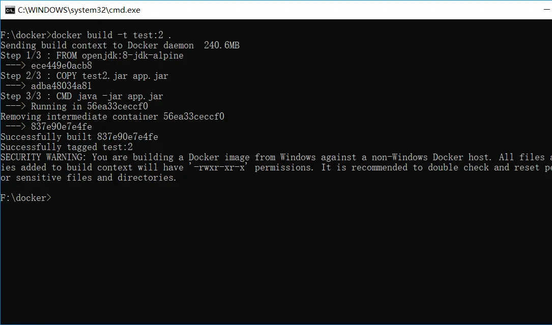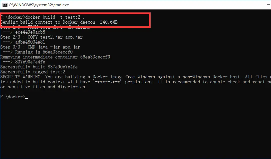 docker 是分为客户端与服务端,docker build过程中docker 客户端将会把上下文路径(F:\docker)的所有文件打包上传至服务端来运行。