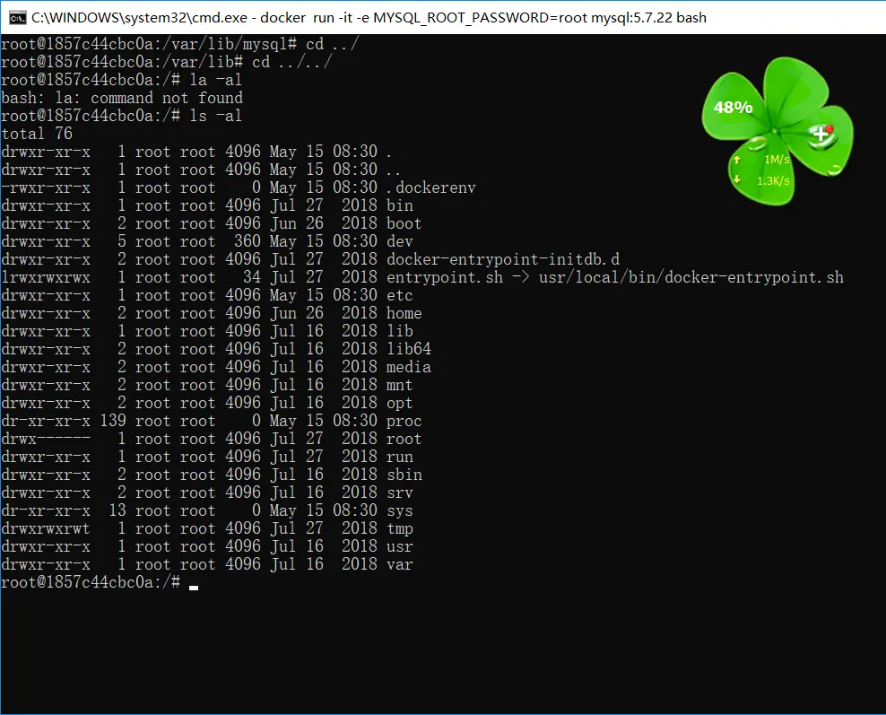 cmd > docker run -it -e MYSQL_ROOT_PASSWORD=root mysql:5.7.22 bash