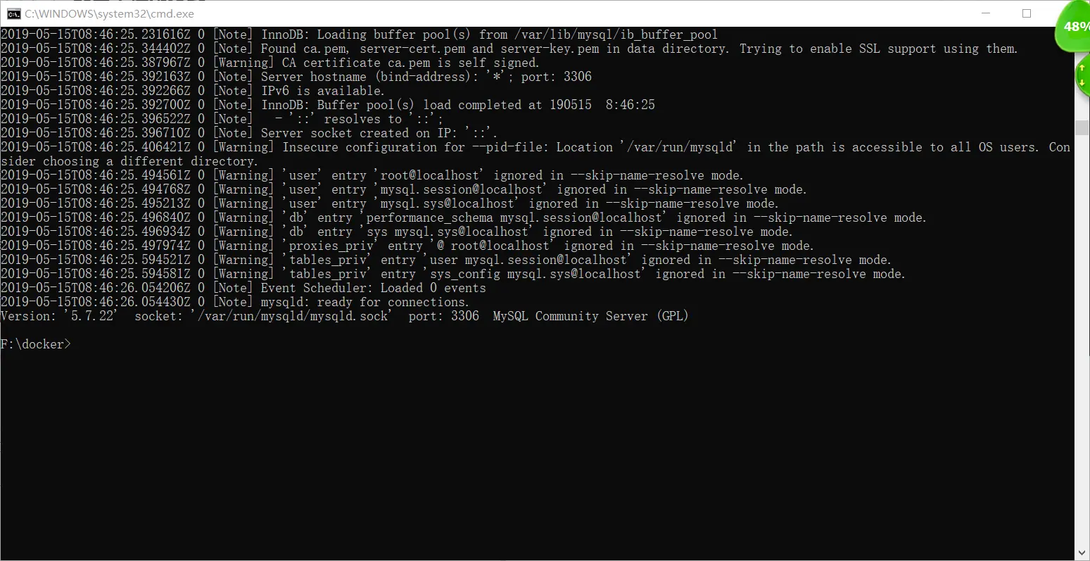 cmd > docker run -p 3406:3306 -e MYSQL_ROOT_PASSWORD=root --name mysql1 -v F://docker/mysql/data:/var/lib/mysql mysql:5.7.22