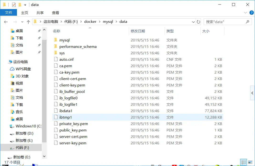 2、exit退出容器,新建容器将F://docker/mysql/data 作为数据卷映射至 /var/lib/mysql