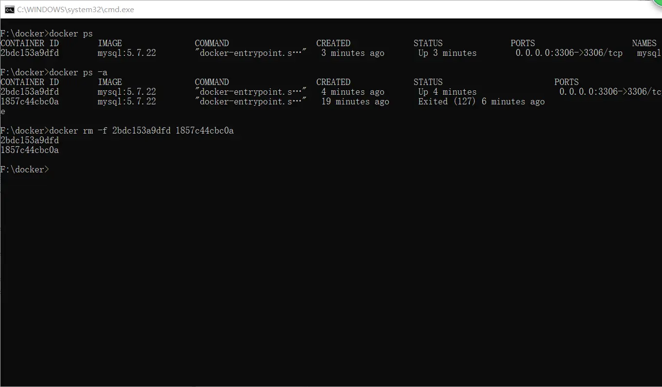 cmd > docker run -p 3306:3306 -e MYSQL_ROOT_PASSWORD=root --name mysql -v F://docker/mysql/data:/var/lib/mysql mysql:5.7.22
