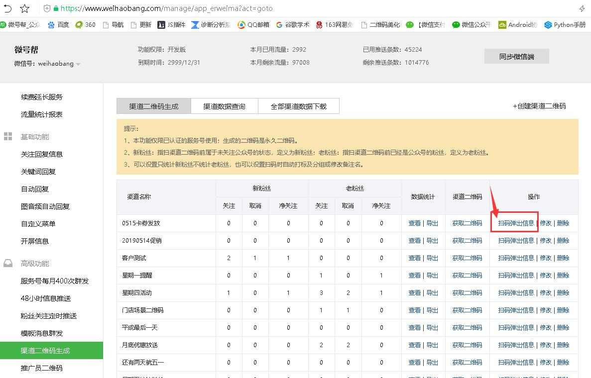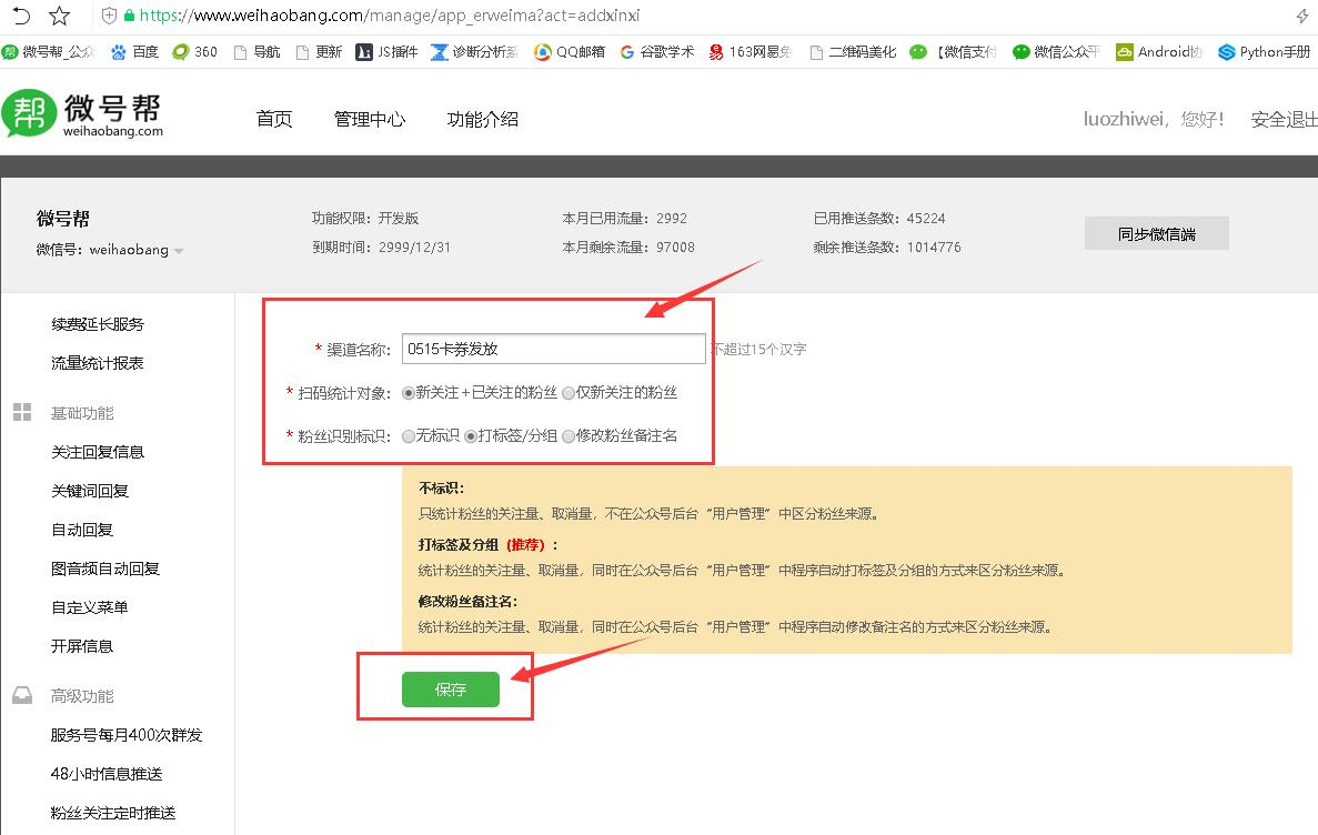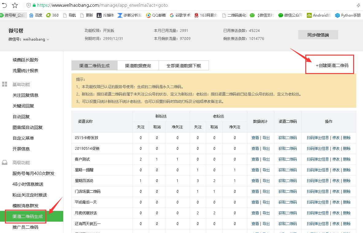 从微号帮后台高级功能点击【渠道二维码生成】,右侧选择+创建渠道二维码