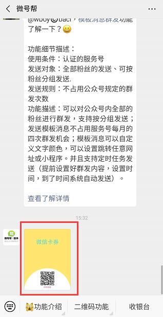 选择公众号后台已经制作好的卡券二维码,默认卡券二维码只有纯黑白二维码,可以自己美化一下,后期可以直接发送卡券