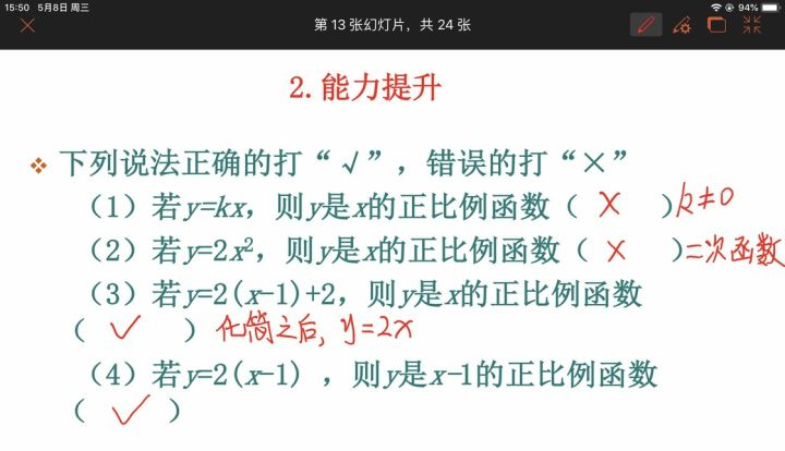 我一开始也是使用电脑加投影仪的方式,播放 PPT,讲解授课。也许有的老师 PPT 制作精美,动效引人,讲解精彩,但方式是一样的,主要区别还是在于教师素质。也有一些老师会运用一些电脑软件,如几何画板、计时器、随机提问的软件等。只是后来,我的电脑越来越卡,开机都要半天,携带也不方便,种种不让人舒服的小原因让我尝试使用 iPad Pro 去上课。