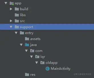 在app目录下,创建一个support/entry目录(名字随意),用于存放入口相关功能的代码及资源文件,将com.lqr.oldapp.MainActivity放到support/entry/java目录下。
