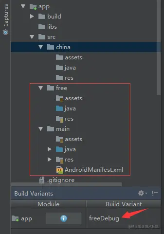 可以看到,当我选择freeDebug变体时,app/src/free下的目录高亮了,说明它们被Android Studio识别,在运行工程时,Android Studio会将free和main下的所有资源文件进行合并,将代码文件进行整合。同理,如果我选择的是chinaDebug变体,那么app/src/china下目录就会高亮。知道如何创建变体目录后,下面就开始进行资源合并与代码整合了。