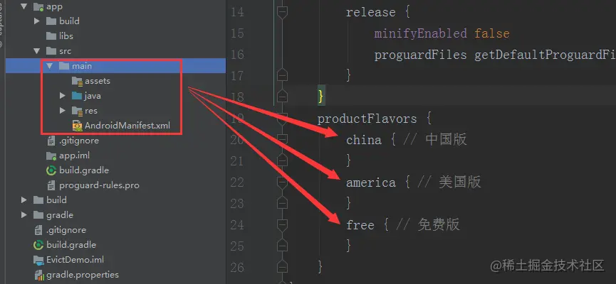前面只说到了res和java这2个目录,那么assets呢,它是属于哪种?很可惜,assets虽然是资源,但它不是合并,而是整合,也就是说,assets文件的处理方式跟java文件的处理方式是一样的,不能在渠道目录和main目录下同时存在相同的assets文件,这将对某些需求实现造成阻碍,举个例子,假设china与free使用的assets资源是一样的,而america单独使用自己的assets资源,并且这些assets资源文件名都是一样的,那这时要怎么办呢?给每个渠道都放一份各自的assets资源吗?这种做法可行,但很low,原因如下: