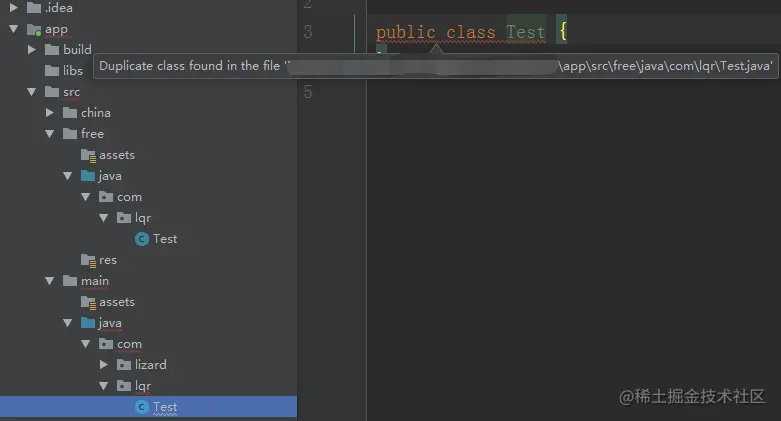 可以看到,一切正常,Test.java被AndroidStudio识别,但如果此时在main/java下也存在Test.java,那么Android Studio就会报错了: