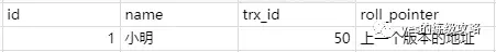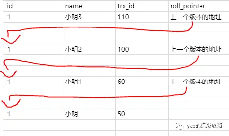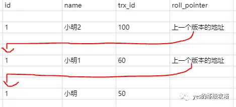 这时候就通过指针继续找下一条,name为小明1的记录,发现trx_id是60,小于列表中的最小id,所以可以访问,直接访问结果为小明1。