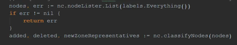 首先通过List接口获取所有的Node信息,通过classifyNodes完成Node的划分。classifyNodes规则划分很简单,比对knownNodeSet和allNodes,可以理解为knownNodeSet为上一次的数据,allNodes为新的数据,则: