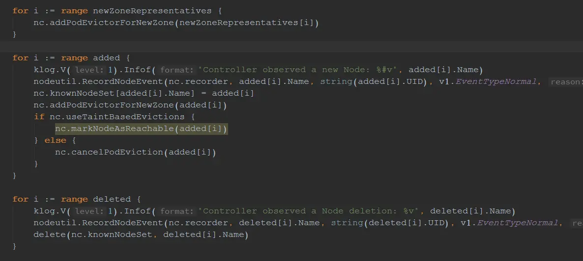 1、待新增的Node,将其加入到knownNodeSet内缓存,通过addPodEvictorForNewZone为其归属一个Zone,通过useTaintBasedEvictions的开关控制,判断是标记Node为Reachable或是取消Pod的驱逐工作。总之就是表示这个Node可以开始正常使用了;