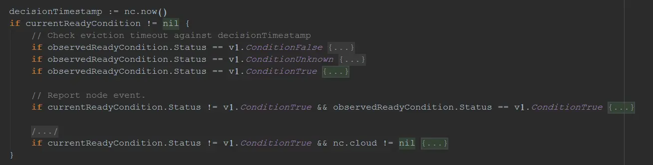 对获取到的所有的Node,调用PollImmediate方法,每20ms,重试5次,去更新Node的状态,主要调用了tryUpdateNodeHealth方法。tryUpdateNodeHealth方法值中,主要关注observedReadyCondition和currentReadyCondition。可以理解为observedReadyCondition表示上一次的Node状态,currentReadyCondition表示当前的Node状态。以下的多重if-else都是根据这两个值来操作的。