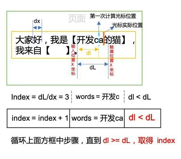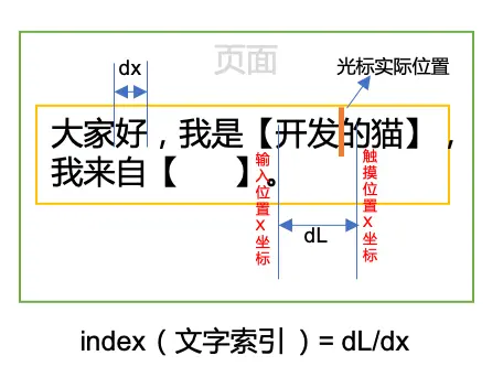 光标所在汉字的索引 = (触摸点x坐标 - 被触摸的编辑字段起始位置的x坐标)/ 单个汉字宽度