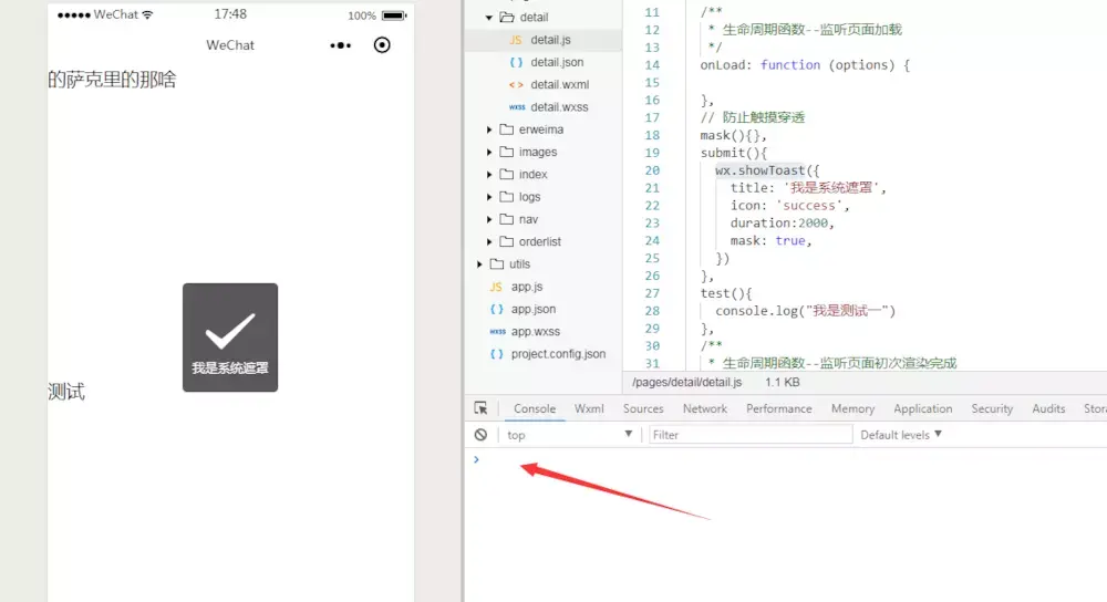 我在“测试”上面绑定了一个点击事件在控制台打印出 "我是测试一" 。在上面绑定的 是弹出小程序自带的弹框提示。