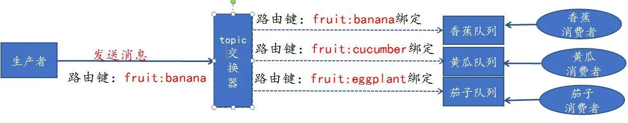 Topic Exchange:路由键匹配,发送消息到 topic 交换器时,它会根据路由键通配符匹配去寻找绑定到此交换器上的匹配成功的队列,然后投递消息