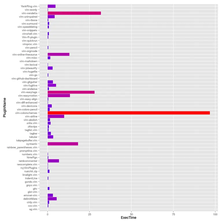 因为同一个插件会有多行数据,我们要手动把同一插件的第三列统计一个总和,这样很繁琐,所以 github 上有人写了一个插件,专门用于分析每个插件的执行耗时,并输出直线图,具体可以看看:github.com/hyiltiz/vim…