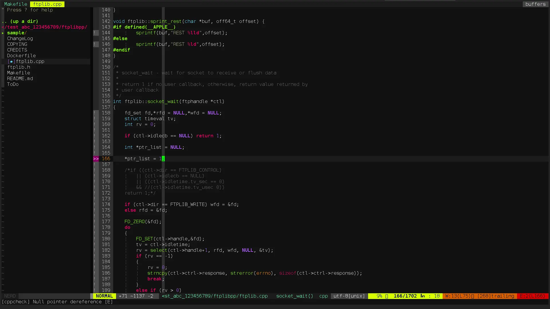 以一小段有代码展示 cppcheck 和 ale 的语法检查结果: