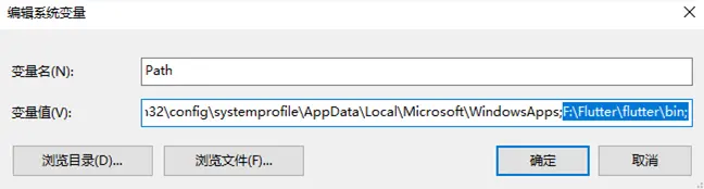 配置 flutter 环境变量 如果想在命令行中使用 flutter 命令,需要添加flutter的路径到系统变量path中。 我的flutter路径为F:\Flutter\flutter,那么就将F:\Flutter\flutter\bin放到系统变量path中。