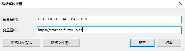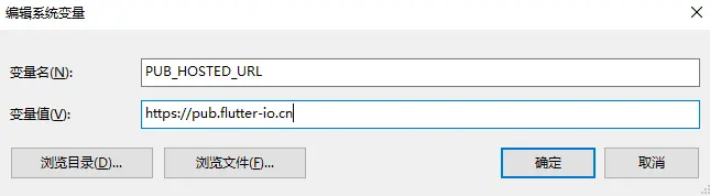 这里使用Flutter的官方镜像,将这两个url配置到用户环境变量中: