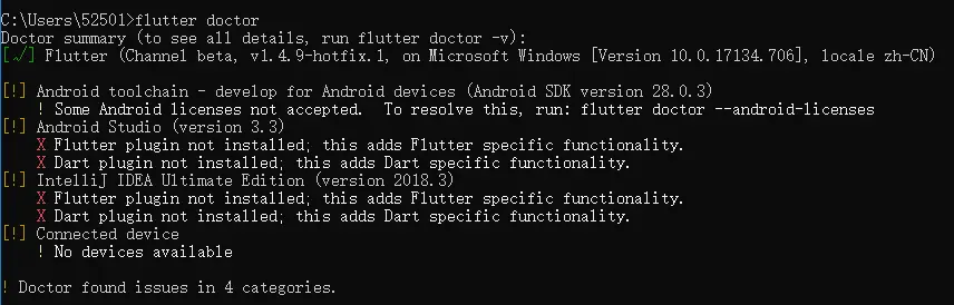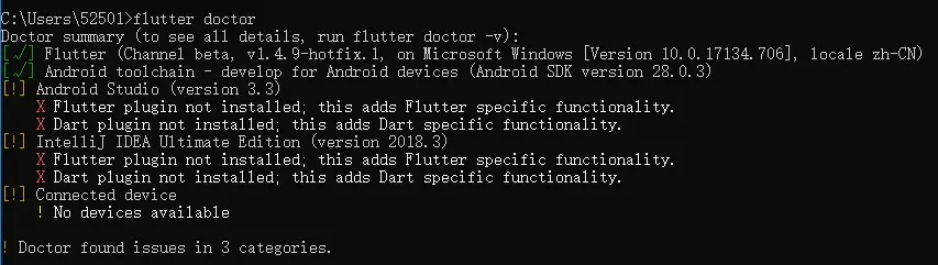 安装成功后重启Android Studio。这时cmd输入flutter doctor命令,就会看到提示信息的Android Studio的版本依赖项为√。