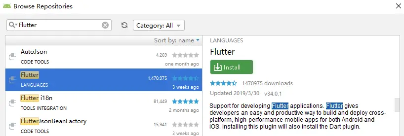 安装Flutter和Dart插件 Android Studio的File --> settings --> Plugins --> Browse repositories,在搜索框输入Flutter和Dart来安装它们。