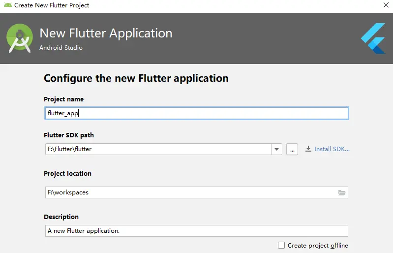 Project name需要小写,接着设置Flutter SDK的位置和项目的位置,如果没有下载Flutter SDK,可以点击install SDK下载,如下图所示。
