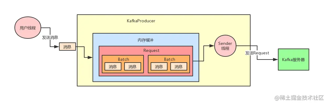 然后KafkaProducer有一个Sender线程会把多个Batch打包成一个Request发送到Kafka服务器上去。