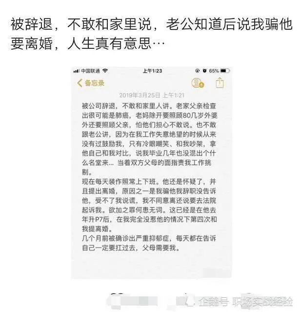 今日笔者看到这样一则案例,有位女研究生在公司因为工作问题被公司所辞退,可是由于家里有各方面的原因,这位女研究生并没有和家人说辞职的事情,但是程序员老公知道实情以后,却主动跟这位女研究生提出了离婚,原因也是让女研究生没有想到,因为程序员告诉女研究生,他不能接受婚姻里有谎言,对此这位女研究生也是在职场论坛发帖希望大家能给她一些建议。