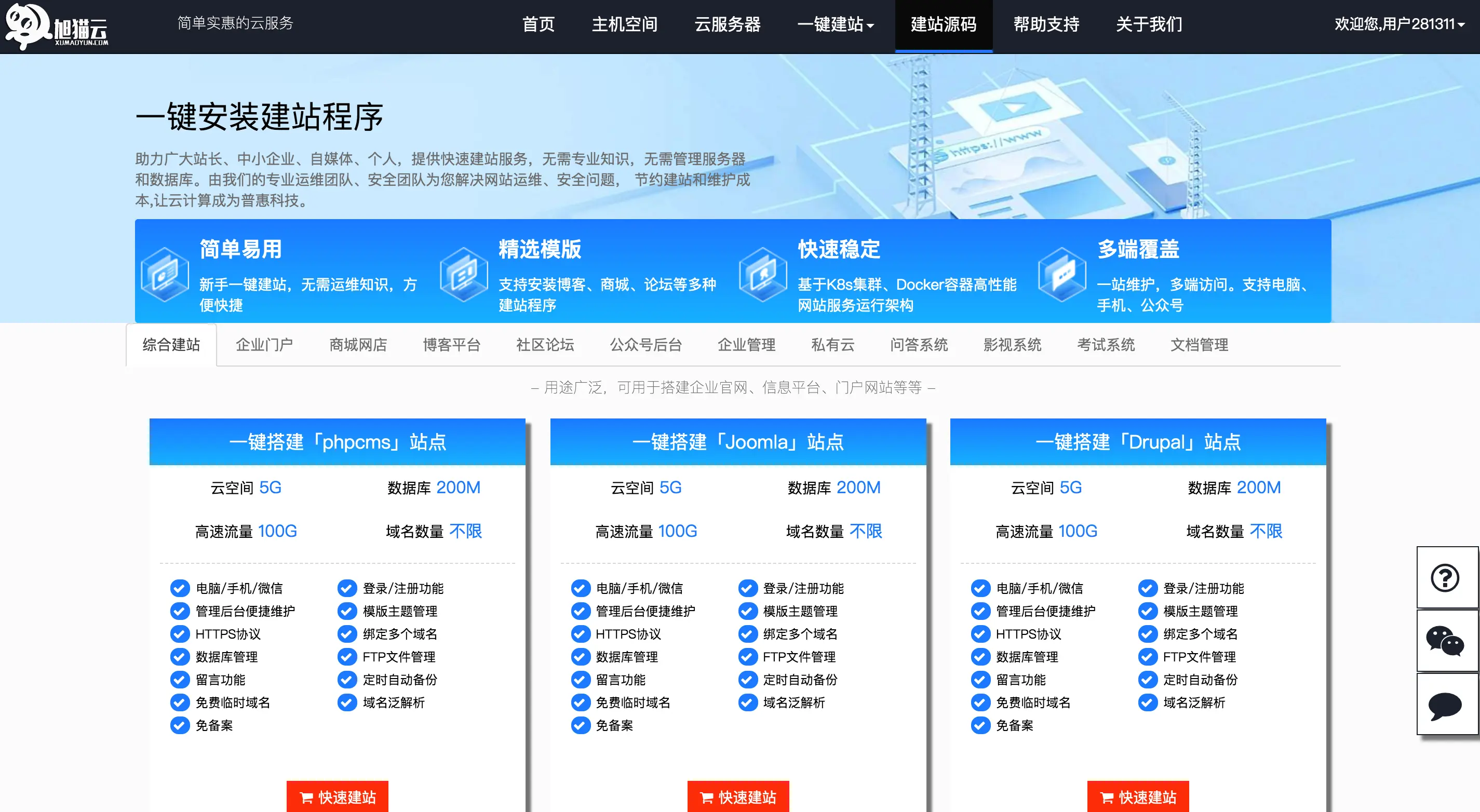 这里我们通过旭猫云的一键建站功能来搭建我们的网站,旭猫云收集了很多开源免费的建站源码,我们可以根据自己需要选择相应功能的源码进行建站。