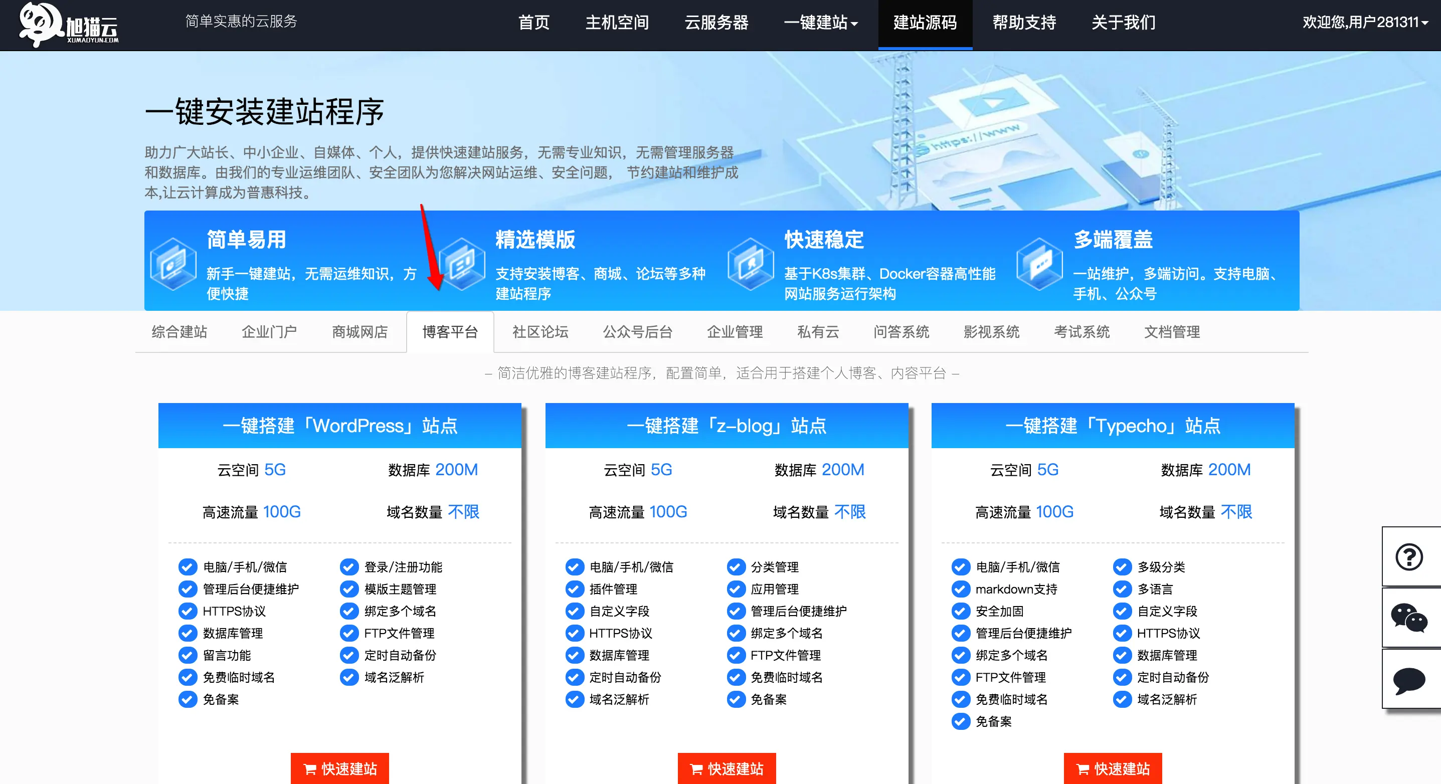 这里以建立一个博客为例,我们选择“博客平台”标签页,如图: