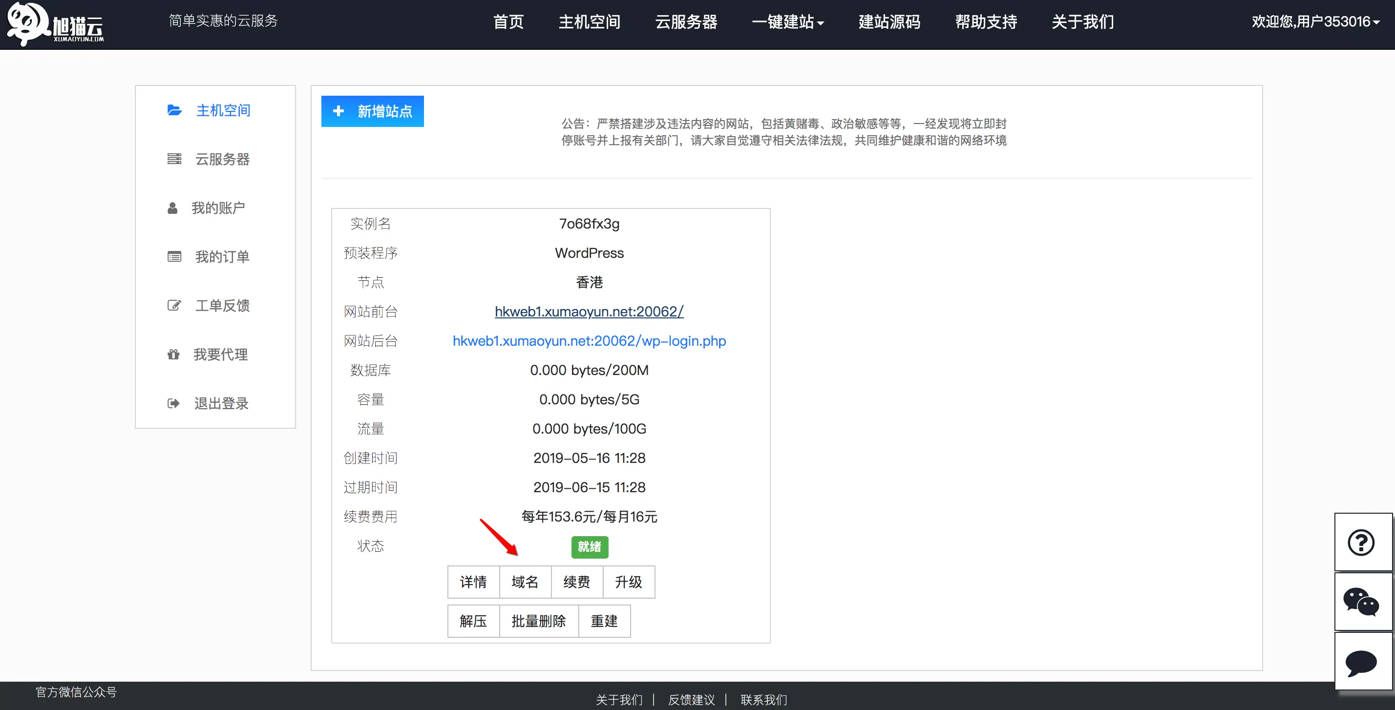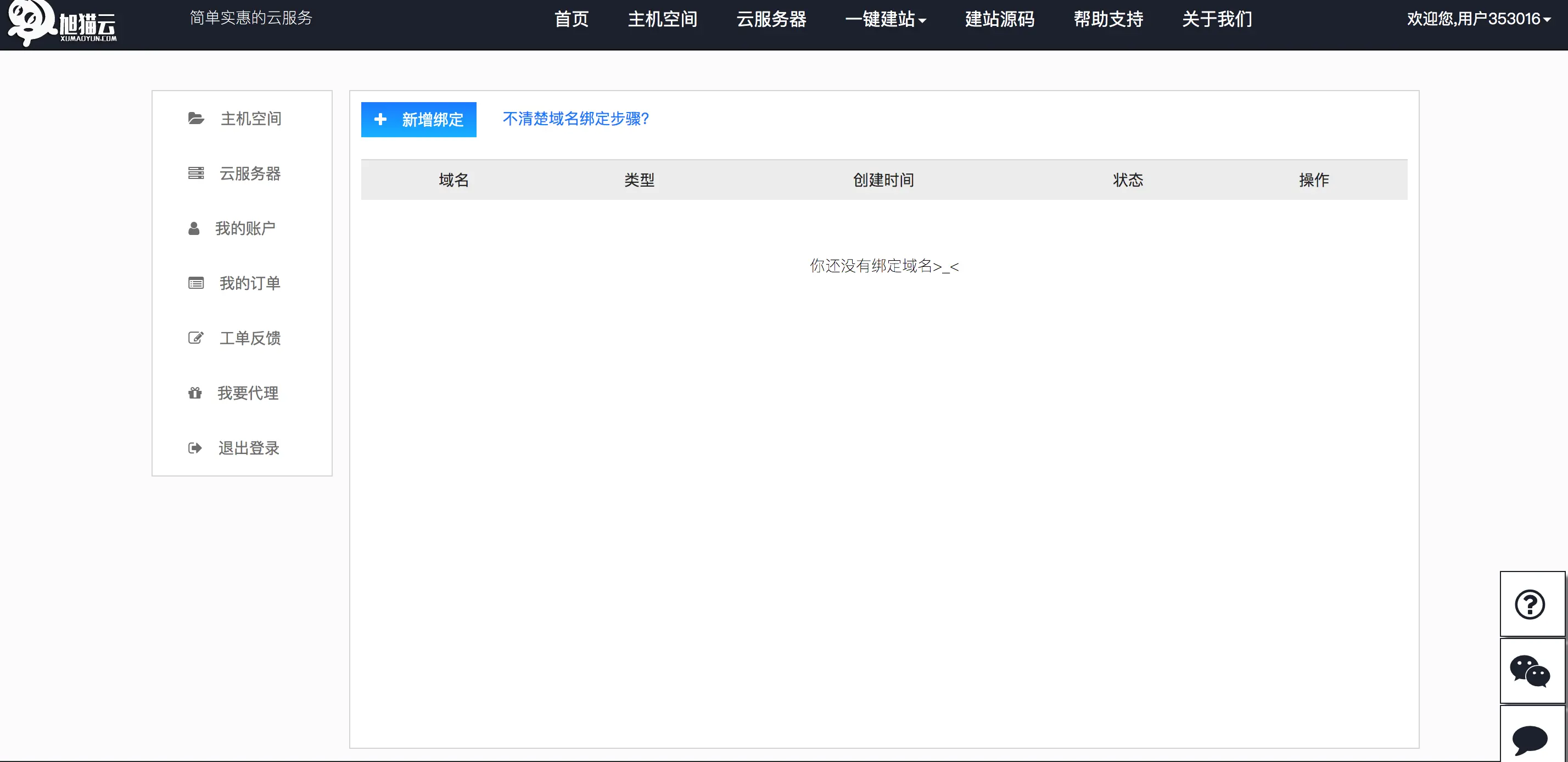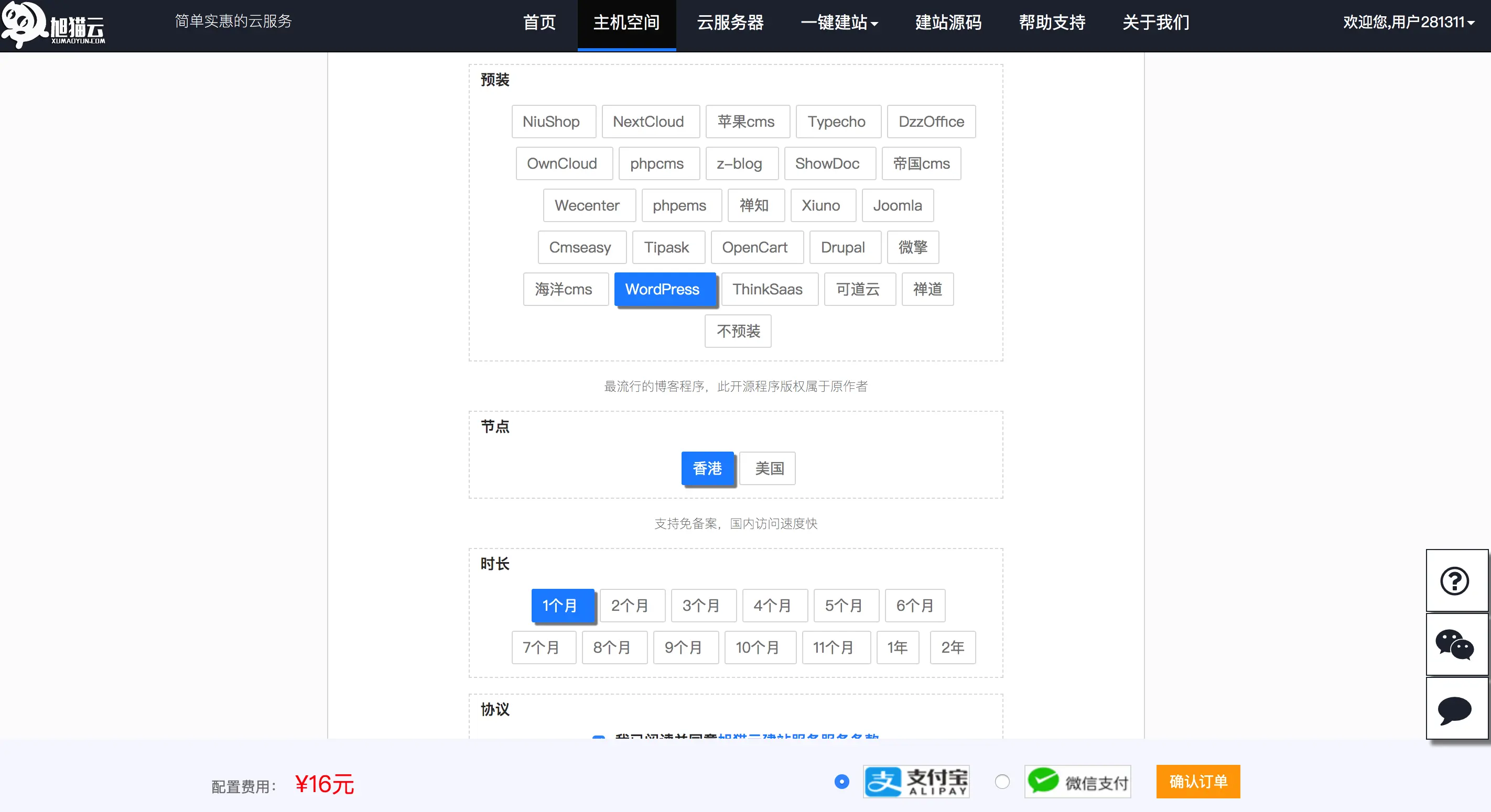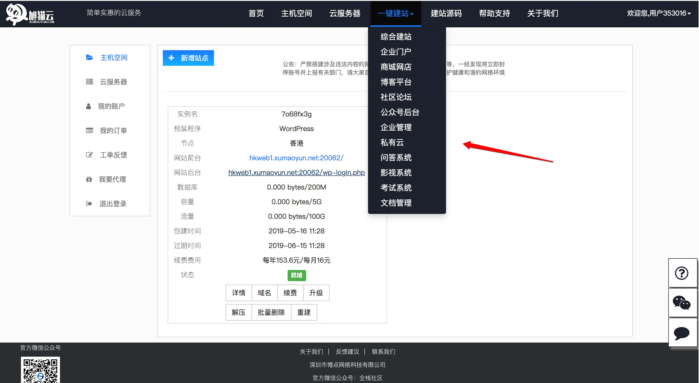 - 在旭猫云选择网站类型,然后一键建站 (成本16元/月)