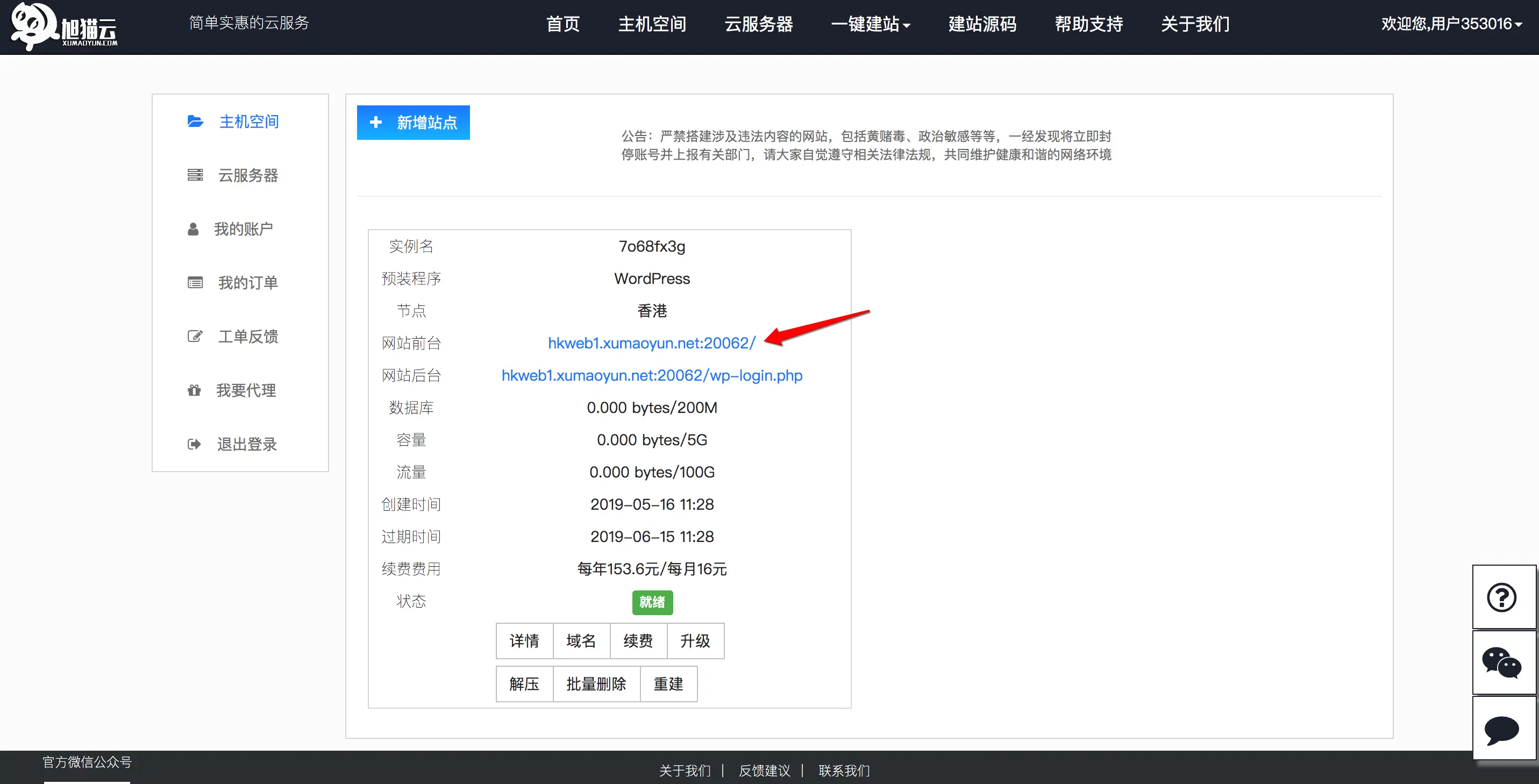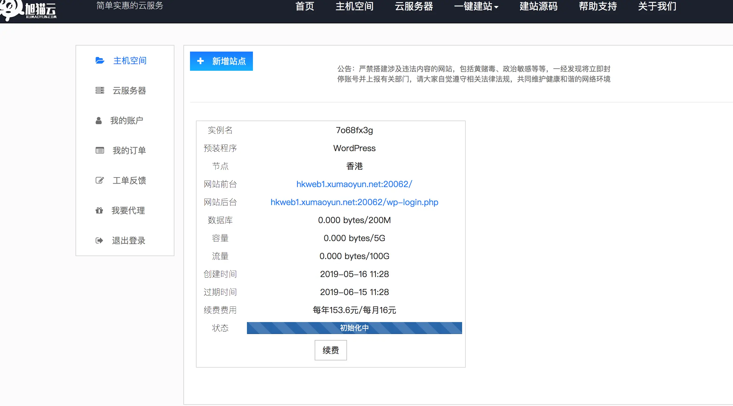 旭猫云会通过自动化运维技术为你搭建网站环境、生成文件和数据库,稍等1分钟左右,点击网站前台地址就可以访问建好的网站了