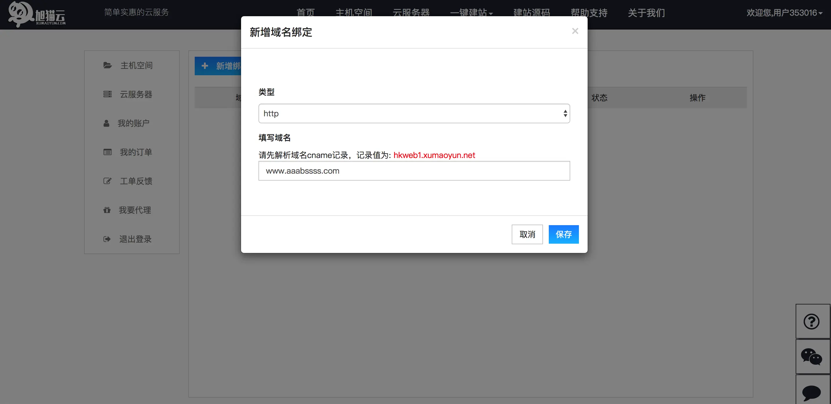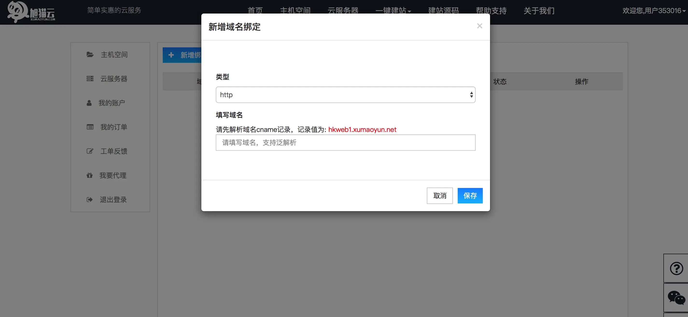 旭猫云建立的站点支持绑定多个域名、支持HTTPS、支持泛解析。我们点击“新增绑定”按钮,会弹出一个弹窗: