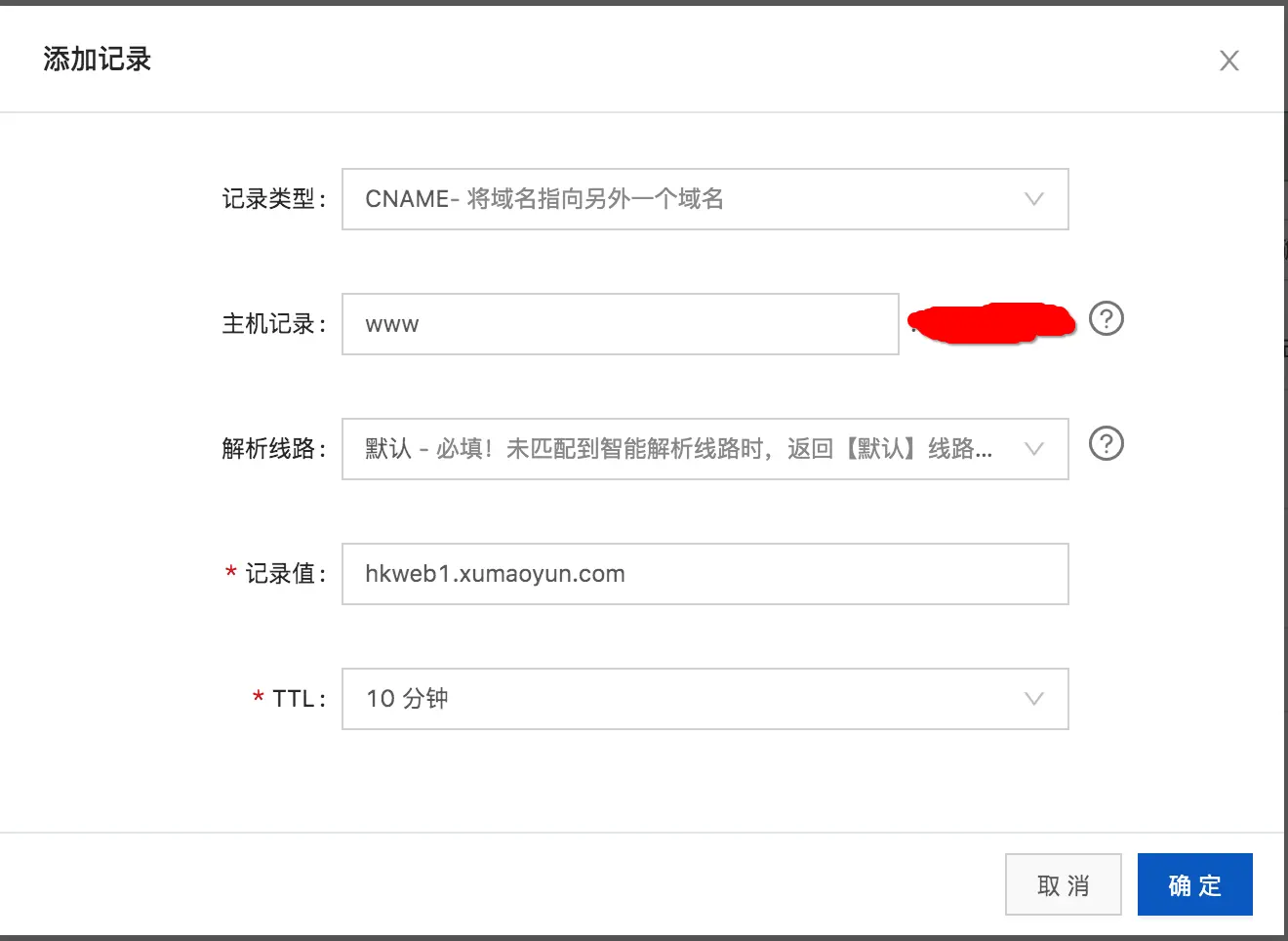 这里我们以绑定http类型的域名为例,先访问阿里云管理后台,将我们在步骤二购买的域名解析上cname记录,如图: